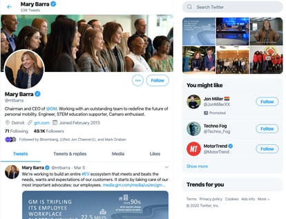 Take a look at GM’s Mary Barra. Her cadence is consistent, but by no means breakneck. But her tweets are engaging, personable, on brand, and on message. For example, one of Barra’s initiatives with GM is a program to inspire girls to pursue careers in engineering and other STEM areas of focus by regularly discussing this passion project on Twitter, Barra’s content becomes more than GM promotion and extends content to an audience beyond Fortune 500 enthusiasts and motorheads of the world.